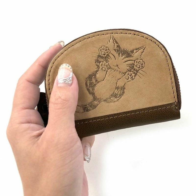 手触りが良いスエード調の革に、ぷっくりくっきり入ったこだわりの熱押しにゃんキューがポイント!人気の半円型小銭入れです。