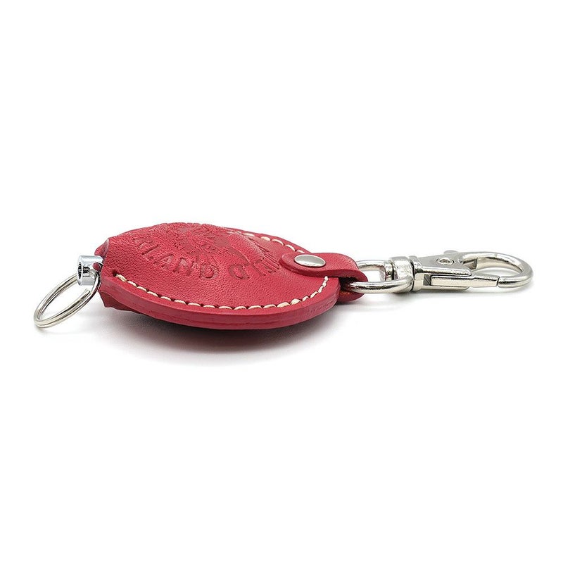 鍵の取り回しに便利なリールキーホルダーを、革でカバーしておしゃれな装いにしました。熱押しでシンプルにまとめ、革の風合いを楽しんでもらえるデザインになっています。実は革工房から出た端革を利用した、エコなアイテムです。