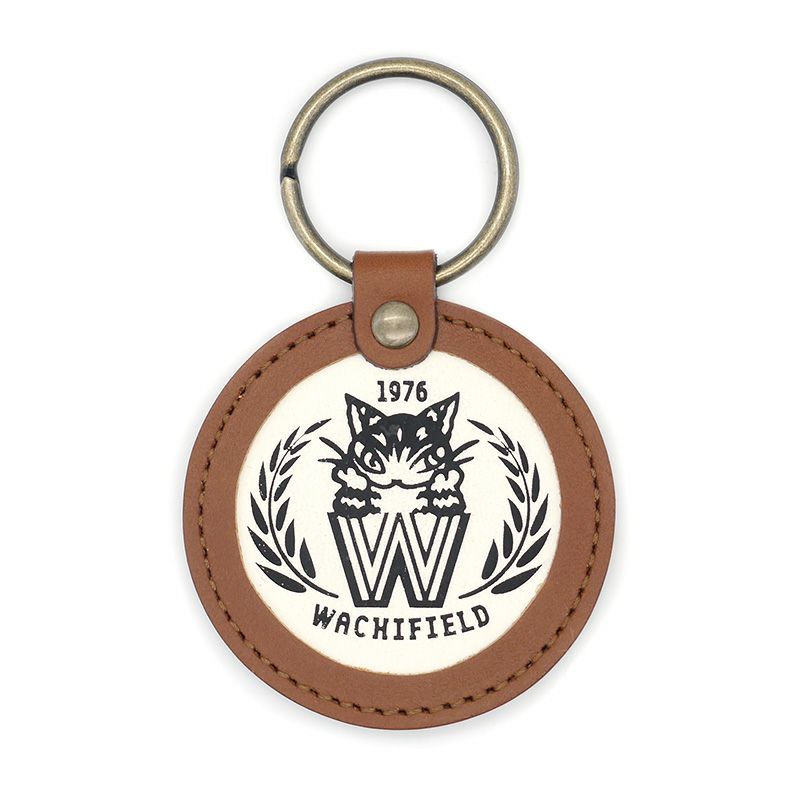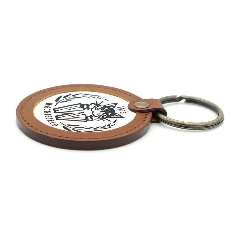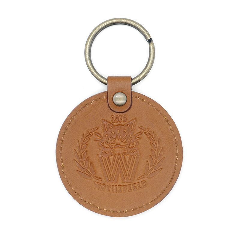 カレッジエンブレムが入ったシンプルなレザーキーホルダー。裏面にもガッツリ熱押し入りで高級感ある仕上がりです。