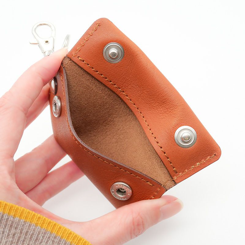 片手にすっぽり収まるミニサイズのキーホルダー。ホックを開けると小銭が入れられるスペースがあるので、鍵と小銭を一緒に持ち歩けます。お釣りをもらって突然増えた小銭も入れられるので安心です。
