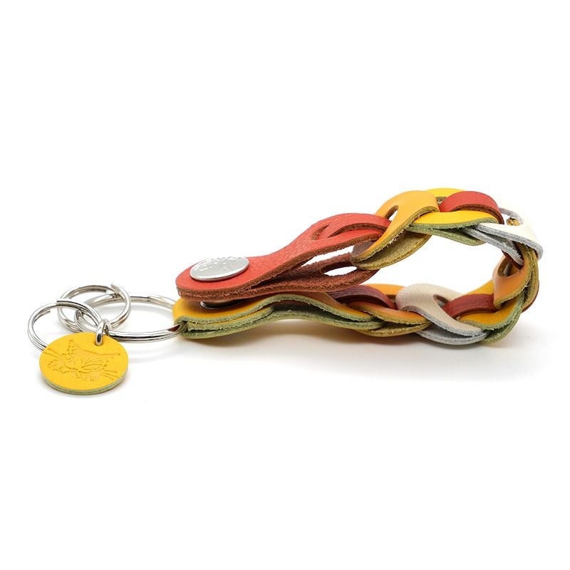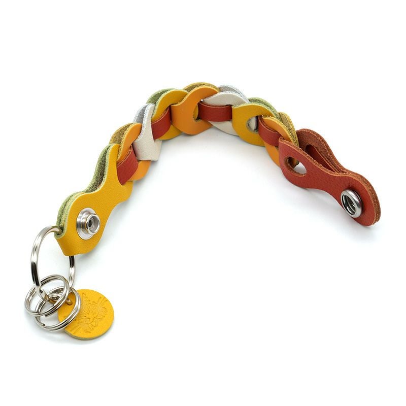 革の端材を使って作ったベルトキーホルダー。小さな革パーツを連結したおしゃれなデザインです。