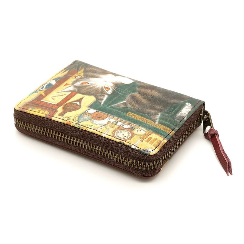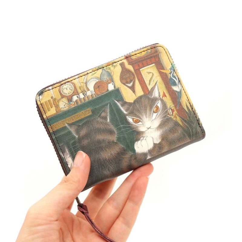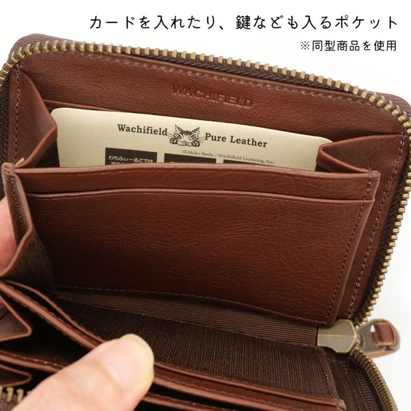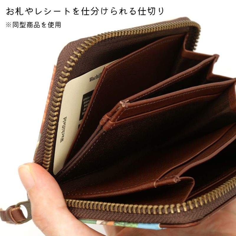 使いやすいラウンドファスナー型の小銭入れを2つ折りのお札も入るサイズにして、洋服のポケットにも入るようなコンパクト財布にしました。片側だけにマチを付けたので小さくても中身がとても見やすく、出し入れしやすいデザインです。小銭ポケットが仕切りを兼ねていて、お札やレシート、カードなどの仕分けもばっちり。わちふぃーるどの世界観あふれる彩り豊かなイラストを革にプリントした、見た目も楽しませてくれるお財布です。