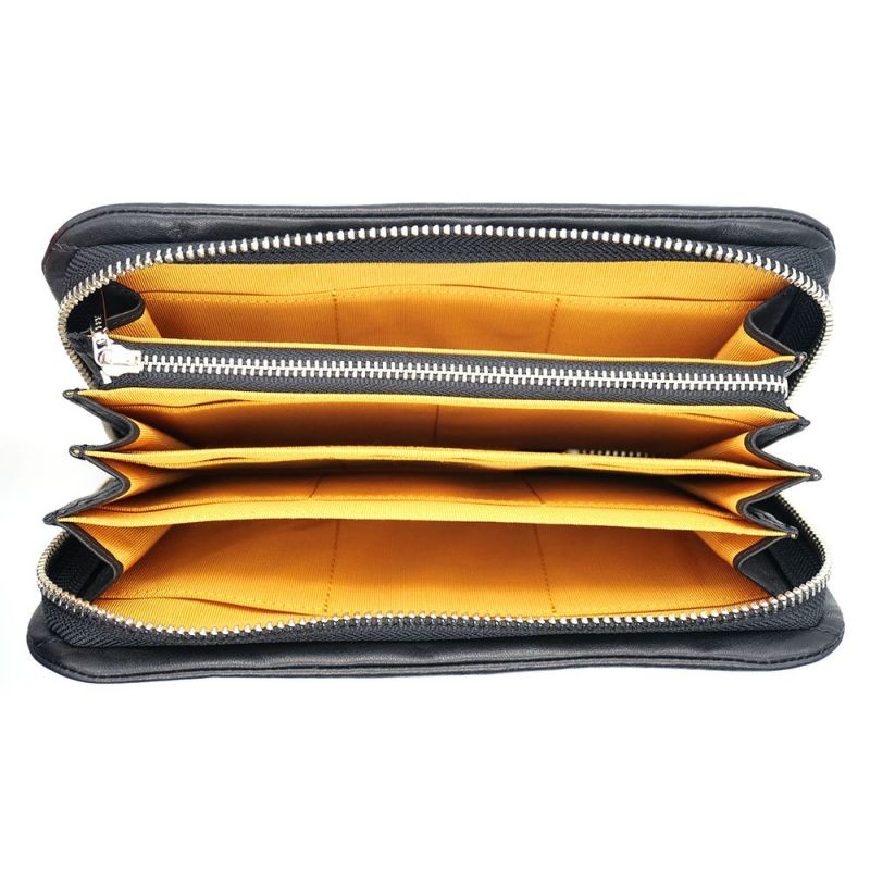 革工房が長年作り続けている、わちふぃーるどの定番「やわらかチップ」が、さらにしっとりとした質感のソフトな牛革を使って「すごくやわらか」になりました。使い始めからしっくりくる手ざわりの気持ちよさをご堪能ください。内装は丈夫なレーヨンシャンタン生地。シックな黒革に、開けると中の黄色い生地が見える色合いのコンビネーションも素敵です。