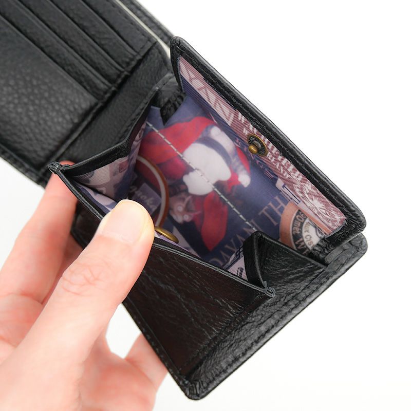 しぼの入った柔らかい黒革に、さりげなくも存在感があるアンティーク調メタルのダヤンロゴが光るクールなコレクション。内側には往年のアルカイックイラストをコラージュした総柄生地を使い、ちらりと見せるおしゃれが楽しめます。シンプルな構造のスリムな二つ折り札入れ。札ポケットは仕切り付きの2室。小銭入れはマチ付きで、小さいけれど中身が見やすいです。