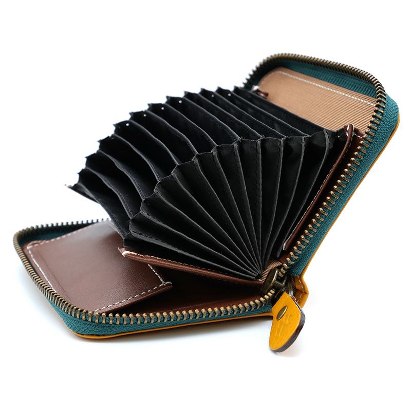 ずらりと並んだカードを一目で見られる蛇腹型のカード入れに、いざという時のためのお札を入れられるようになりました。カード収納の下をコの字に通してお札を収納できます。小銭入れはボックスタイプで、取り出しやすく見やすい構造です。本体の革色とファスナーの明るいバイカラーがかわいいお財布です。