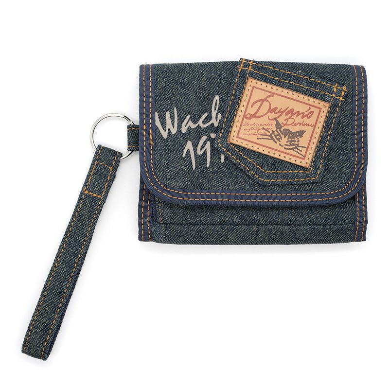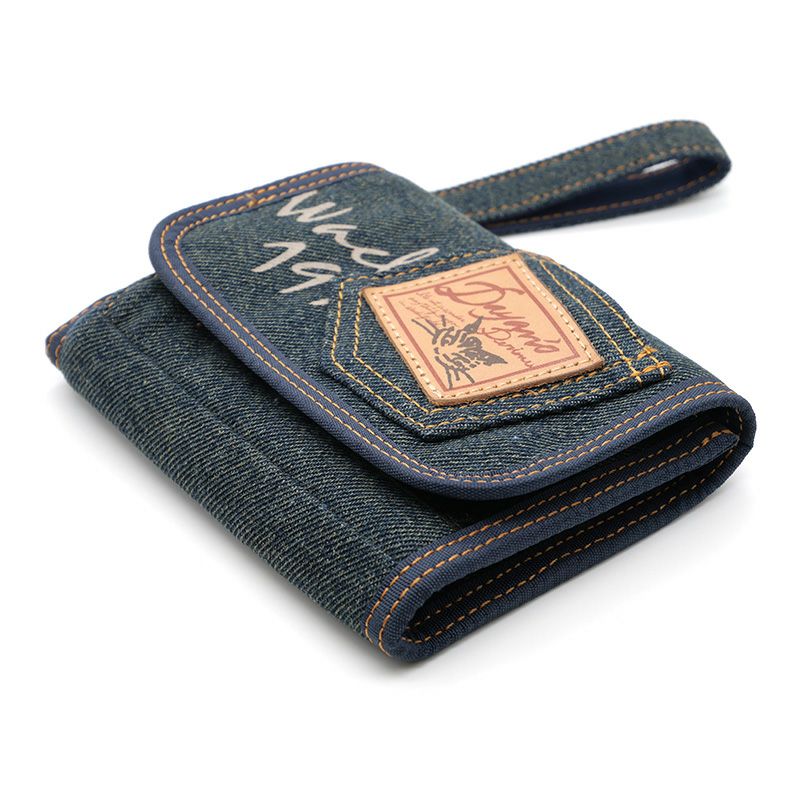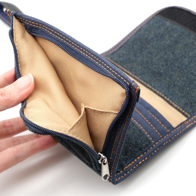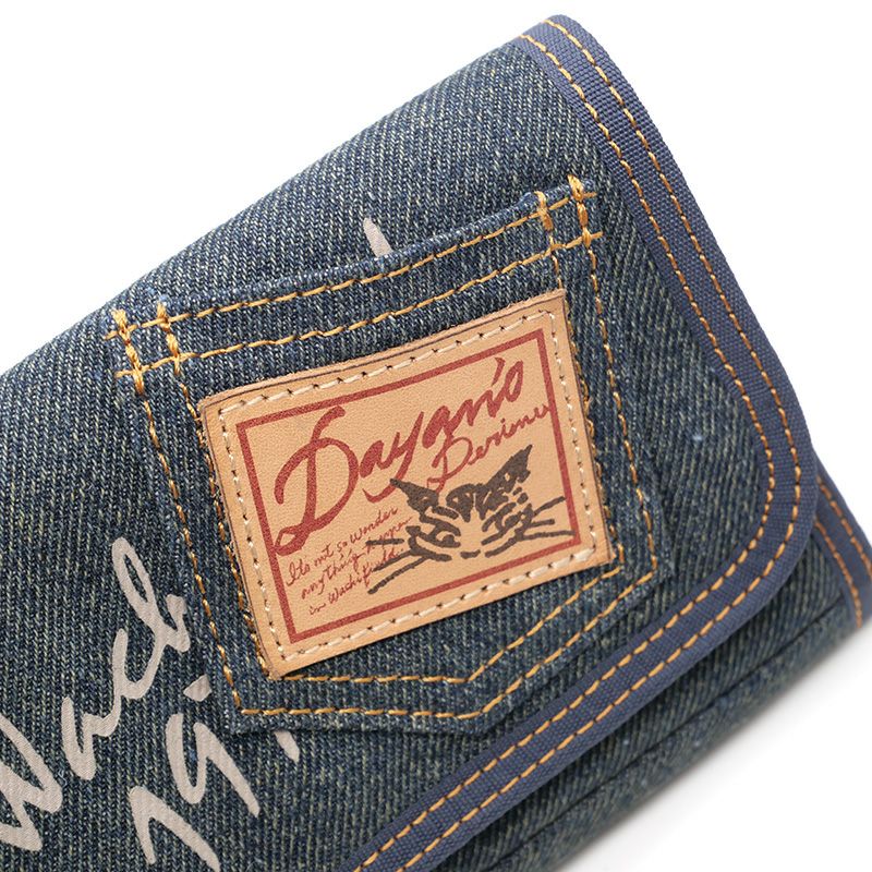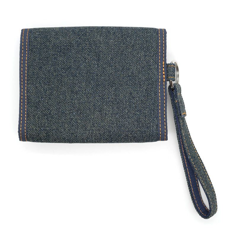 少しウォッシュのかかったミドルカラーのやわらかデニムと、レザーラベルの付いたポケットがアクセントになったベルトストラップ付デニムパースです。実は使いやすい、大人のいわゆるベリベリ財布。豊富な収納で、カジュアルなお出かけのお供に。