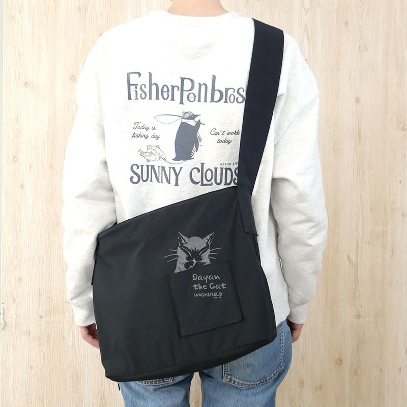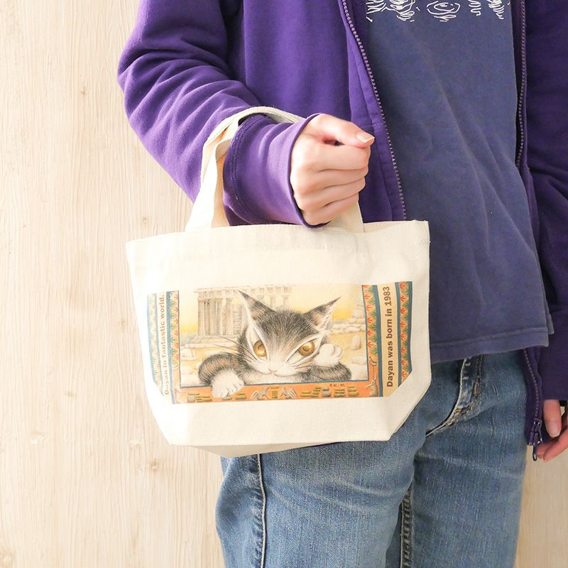 中綿が入った生地でぽてっとしたシルエットの手さげトートバッグ。ダヤンの目元に光るさりげないパール風飾りがポイントです。サブバッグにちょうどいいサイズです。
