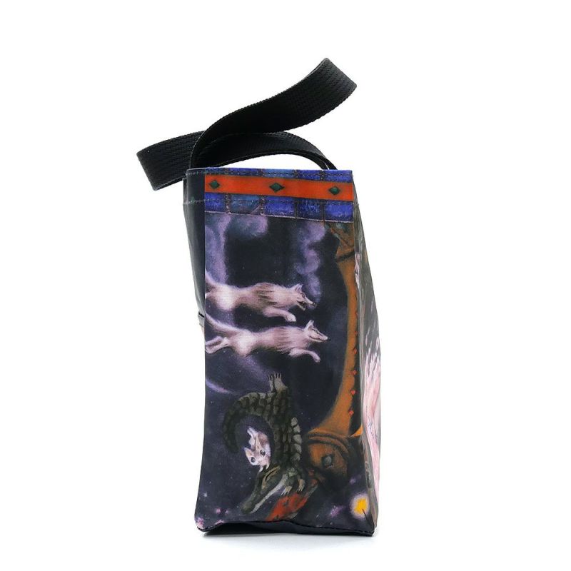 背面に仕切りポケットが付いたミニ手さげバッグです。ちょっとのお出かけやお弁当入れにちょうどよいサイズ。綿生地表面はラミネート加工されており、マットなツヤがあります。