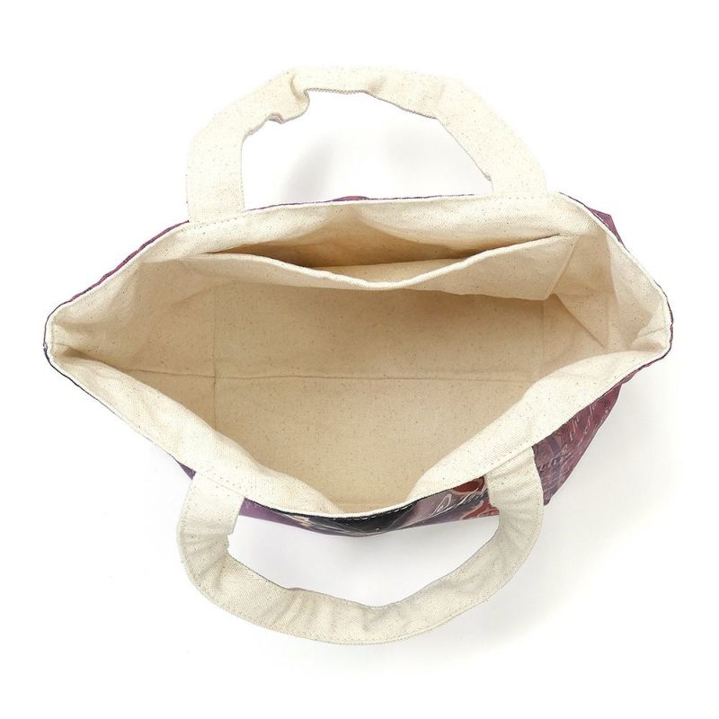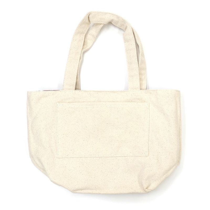 全面にフルカラープリントが入ったポリエステル面と、シンプルな一色プリントの帆布面を好みで使い分けられるリバーシブルトートバッグです。ランチバッグやサブバッグにちょうどいい小さめ手さげサイズです。