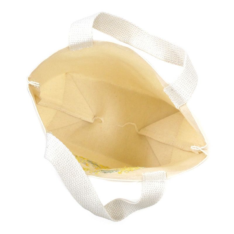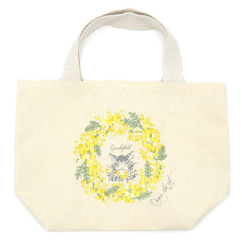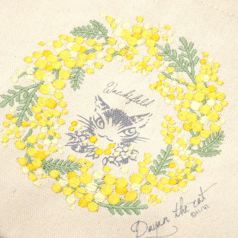 ミモザリースの刺繍とダヤンが可愛らしいシンプルミニトートバッグ。ランチトートにちょうどいいサイズ。温かくなってきた季節にぴったりです。