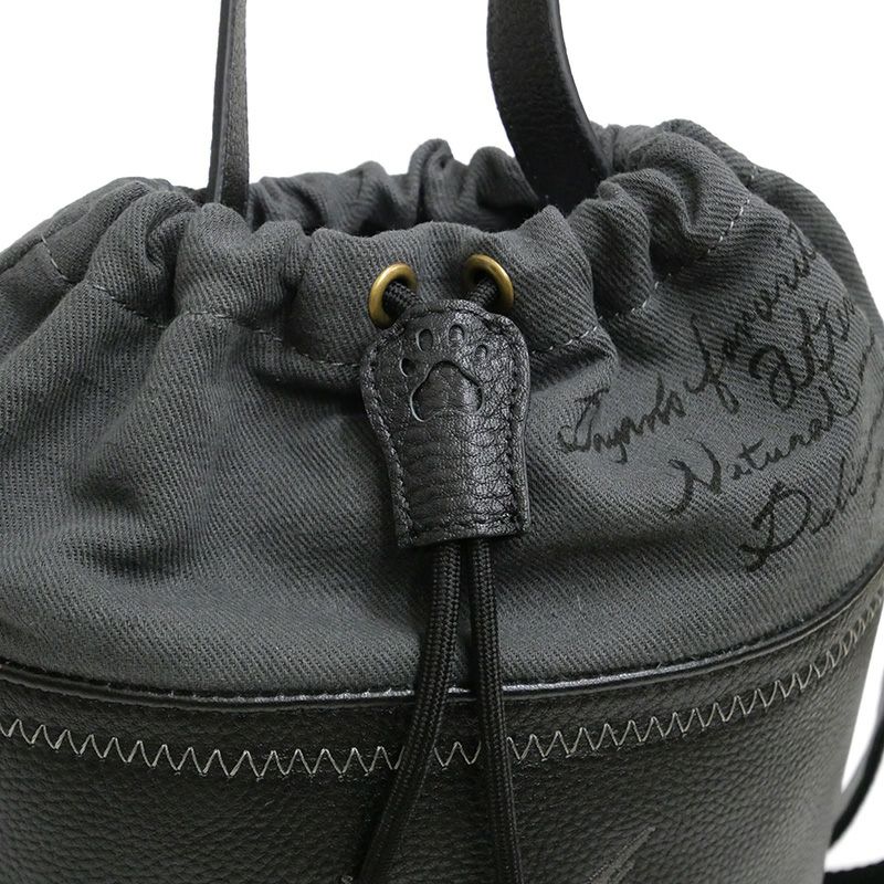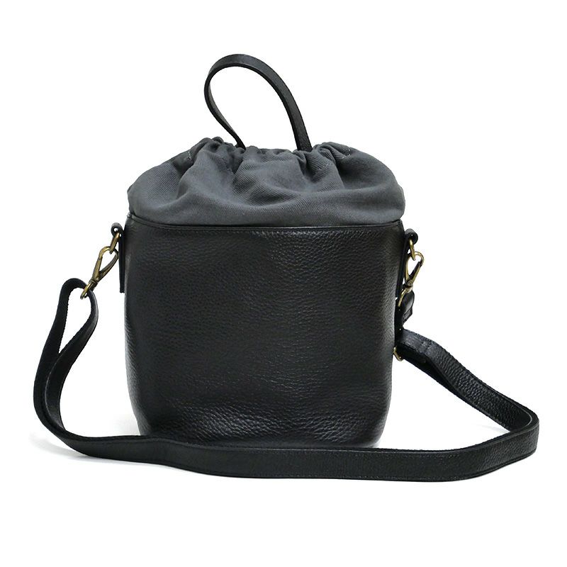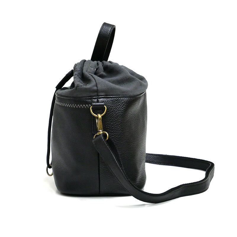 やわらかな革と生地を合わせた使いやすいデザイン。ハンドルスタイルとショルダースタイルで楽しめる巾着ポシェットです。ショルダー紐は外せます。お財布やスマホなどの必需品を持ち歩くのにちょうどいいフォルムがかわいい、おしゃれバッグです。