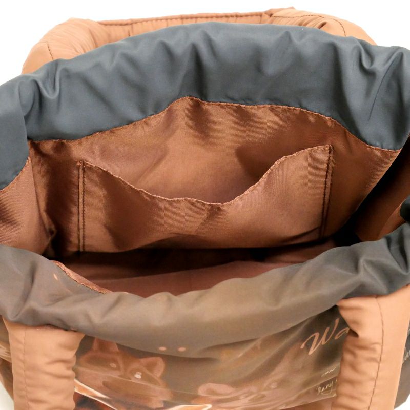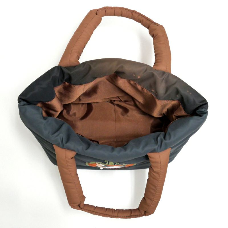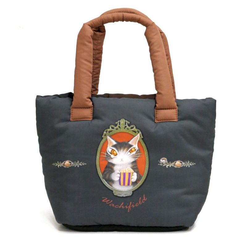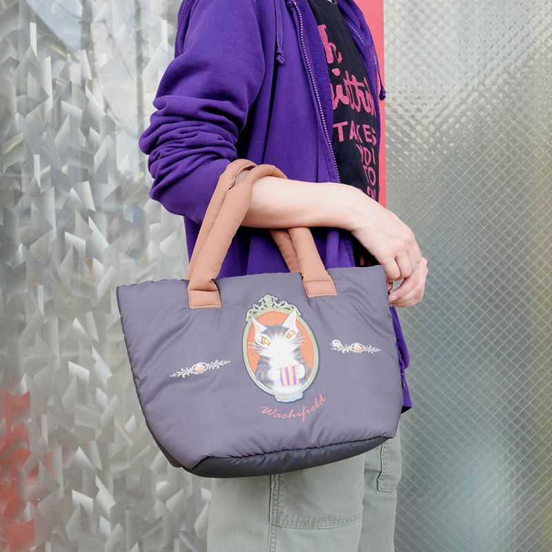 中綿が入った生地でぽてっとしたシルエットの手さげトートバッグ。ダヤンの目元に光るさりげないパール風飾りがポイントです。サブバッグにちょうどいいサイズです。