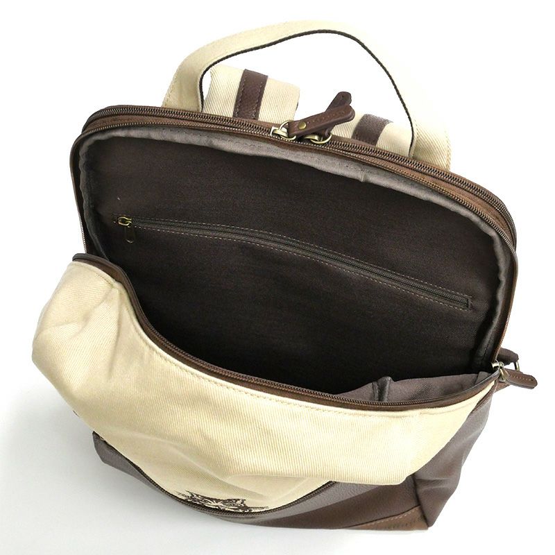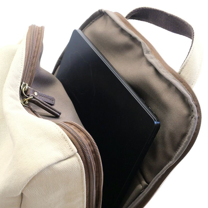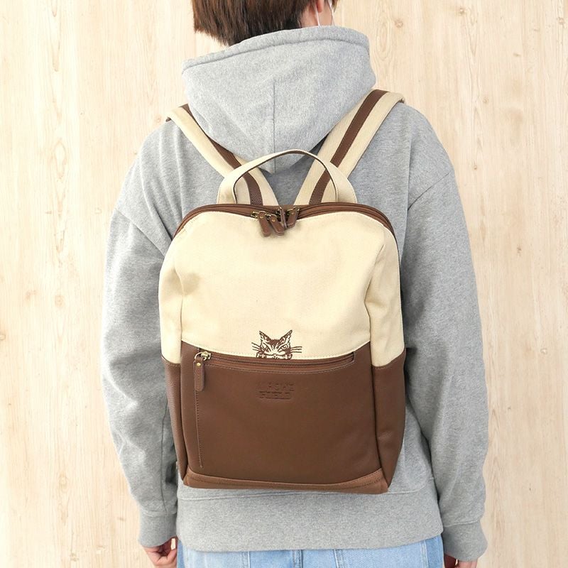 帆布とスプリットレザーのコンビ生地を使った、軽さと上品さを兼ね備えたバッグです。いかにもなPCリュックには見えないビジネスリュックが登場。大きく開くメイン収納はA4ファイルが入るいちばん使いやすいサイズ感。PC収納はクッション入りで、14インチまでのノートパソコンが入ります。オンオフどちらでも使いやすいリュックです。