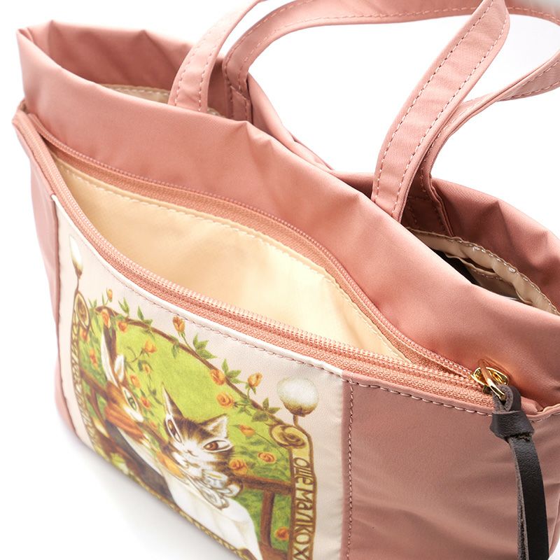 イラスト『バラのお茶会』にぴったりな淡いローズカラーがかわいいミニバッグです。豊富なポケットで小物の仕分けにも便利。