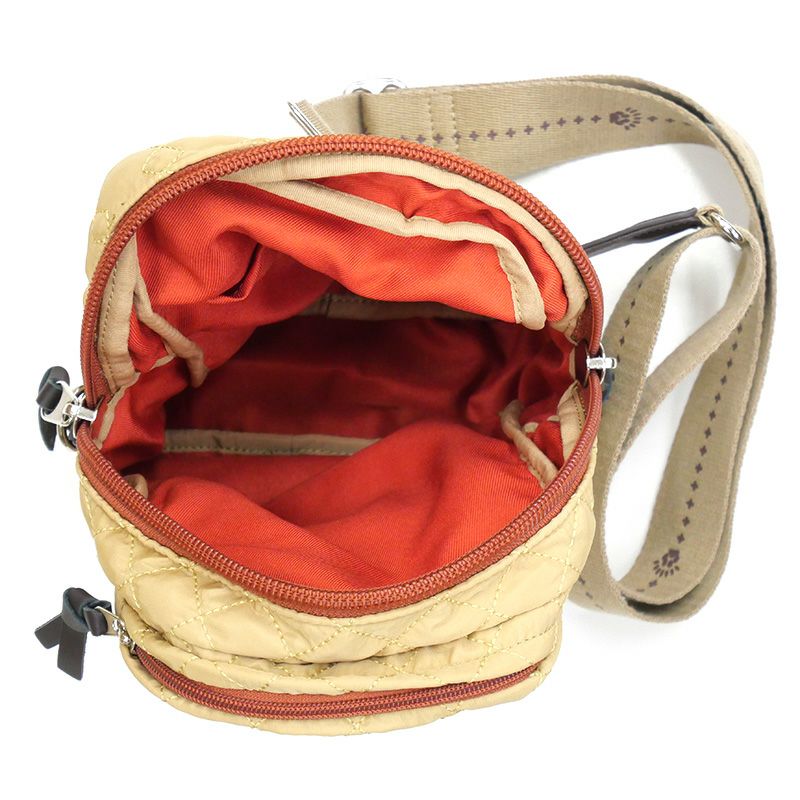 明るいコンビネーションカラーがまぶしいメヒコイメージのシリーズです。長財布やスマホ、500mlペットボトルの収納にちょうどいい、コンパクトなワンショルダーです。正面にはマチ付きのファスナーポケットが2つあり、見た目以上に小物を収納できます。ショルダー紐を短めにして体にフィットさせれば、散策などアクティブシーンにもぴったりです。