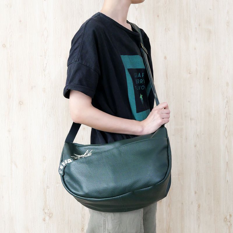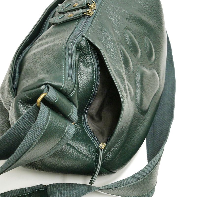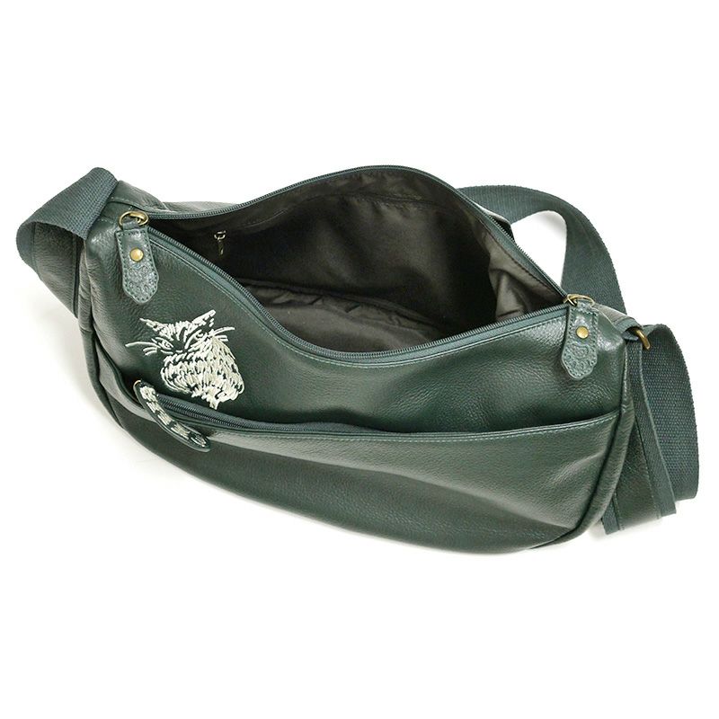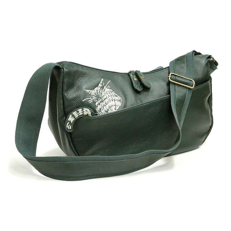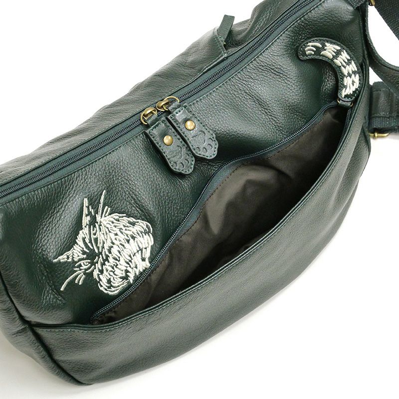 しっとり柔らかな手触りが心地よいシボ入り革を使ったレザーショルダーバッグです。刺繍のダヤンがデザインのアクセントになっていて、どんなシーンでも使いやすいシンプルさも魅力的。ダヤンのしっぽが引手になったフロントポケットは、遊び心だけでなく開閉しやすさもポイントです。背面側にはぷっくり肉球も。ショルダー紐は太めのポリエステルテープに柔らか革を合わせており、負担が少ない掛け心地です。A4クリアファイルがやや曲げると入るサイズ感です。