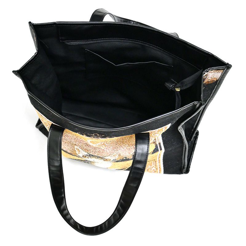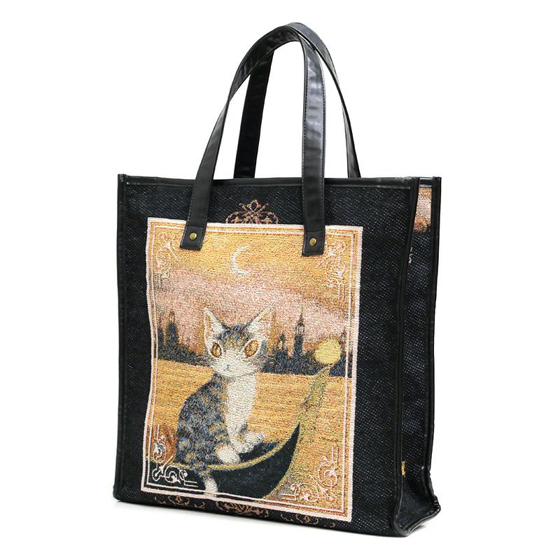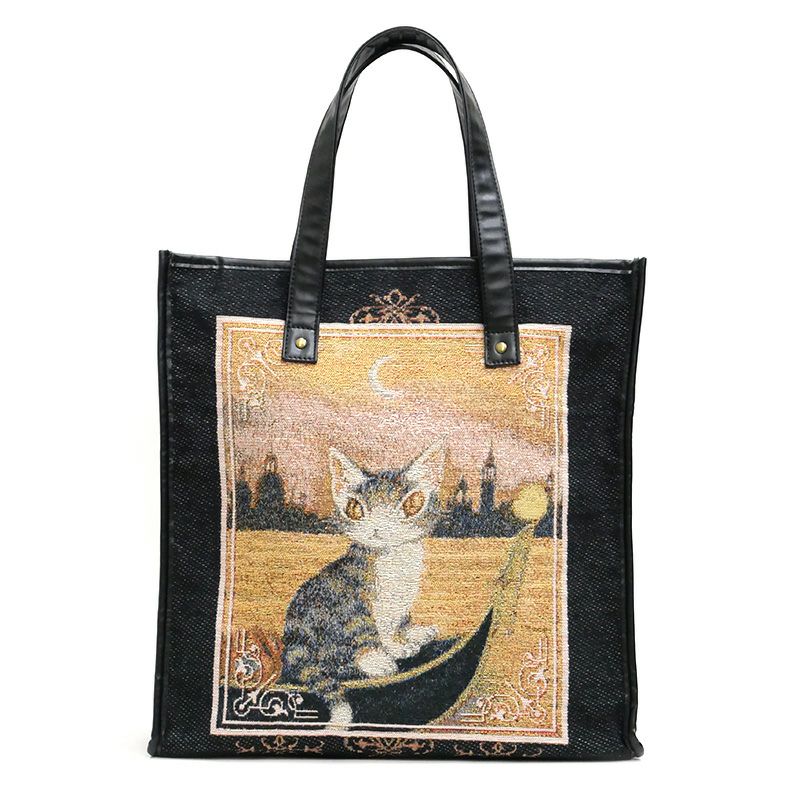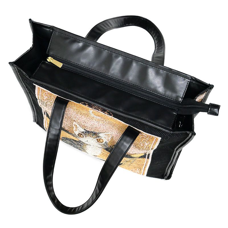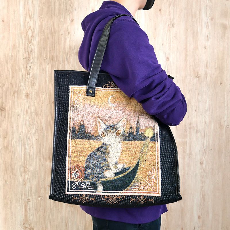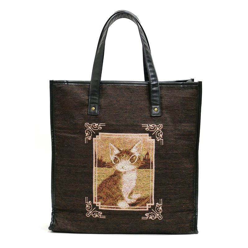 ゴブラン織りでイラストを再現した、大人っぽい雰囲気のトートバッグです。高さもマチもあるので収納力は充分。天ファスナー付きが嬉しいポイントです。持ち手や縁巻きは合皮を使用しています。