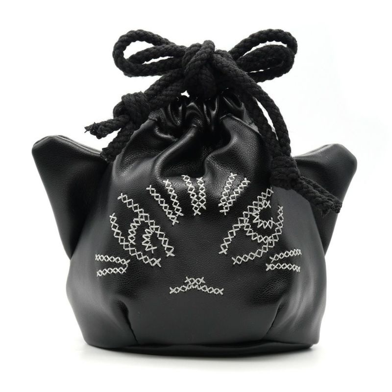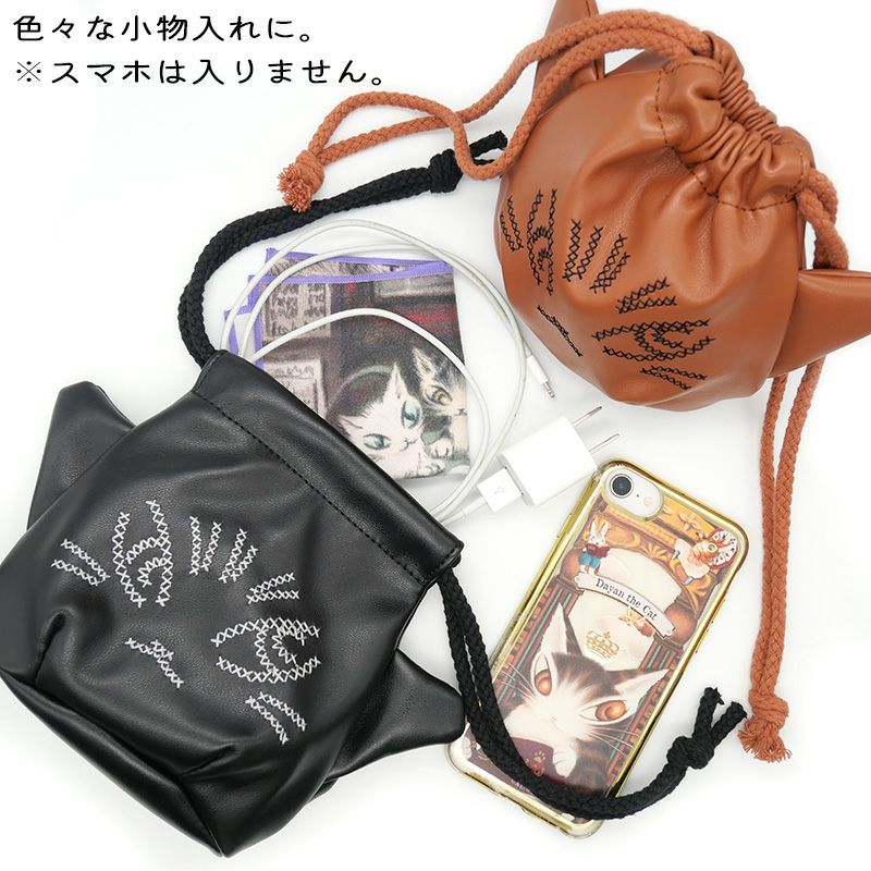 やわらか手ざわりの合皮巾着ポーチです。猫耳付きの丸みあるフォルムに、ダヤンの顔をステッチワークで刺繍したなごやかなデザイン。内側は光沢あるきれいなサテン生地です。手のひらサイズの小物入れに。