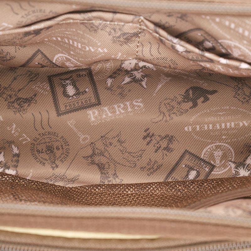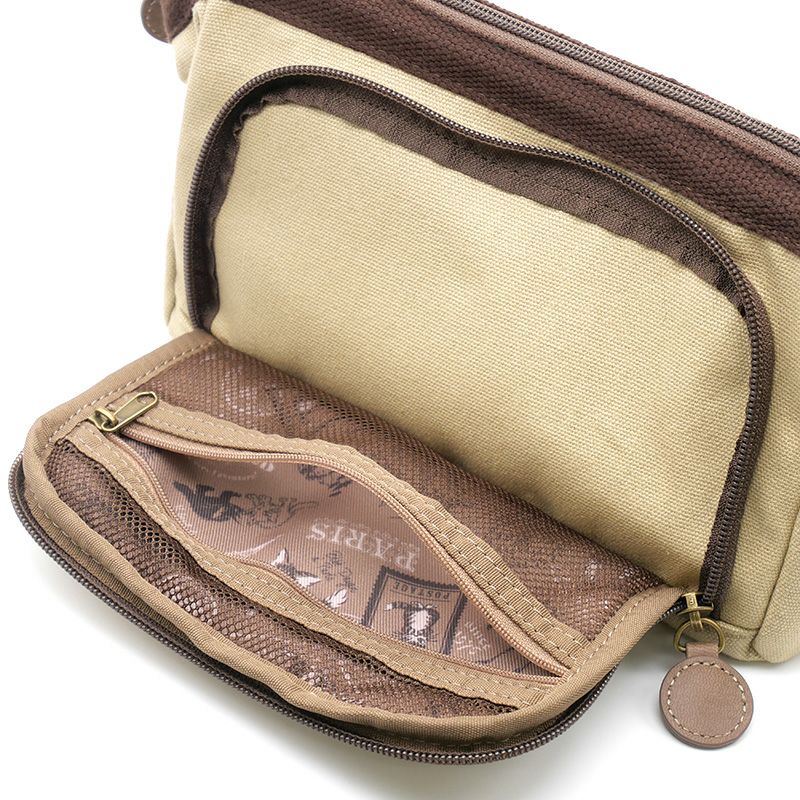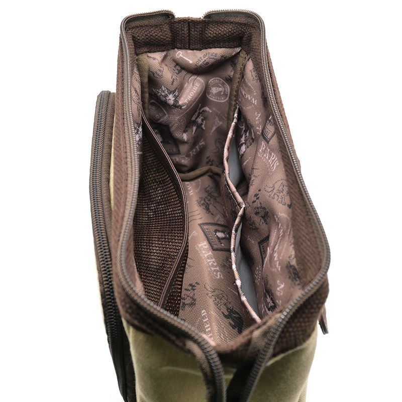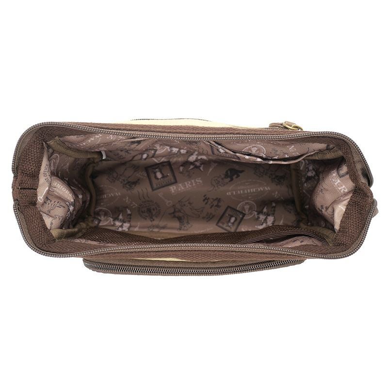 毎日使いの小物をまとめて収納できる大きめキャンバスポーチ。サイズ感としては、600mlのペットボトルが横倒しで底にぴったり収まるくらいの大きさです。正面背面内側と小分けのポケットもたくさん。口金入りなので口を開いた状態で置いておくことができ、中身が見やすく取りやすいです。シックな総柄の内生地がちらりと見えるのも可愛いです。