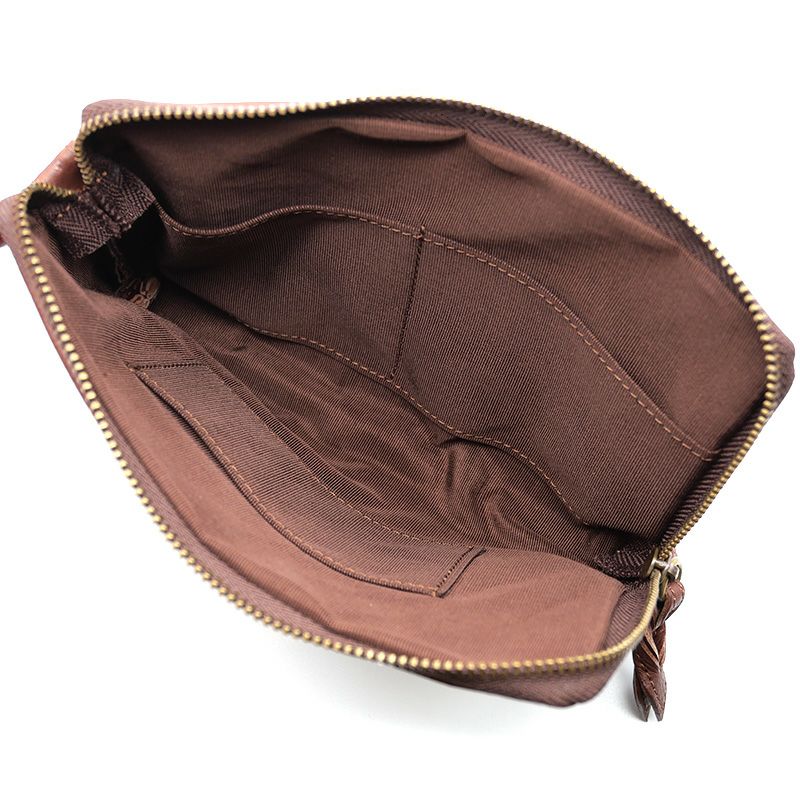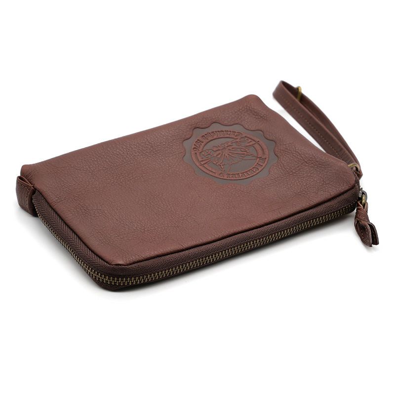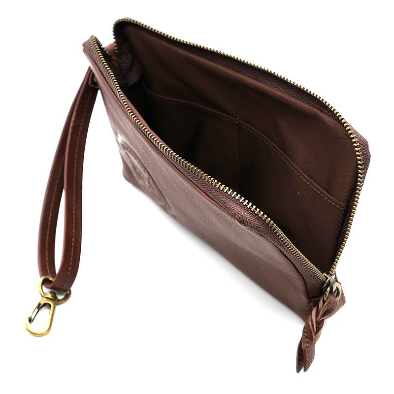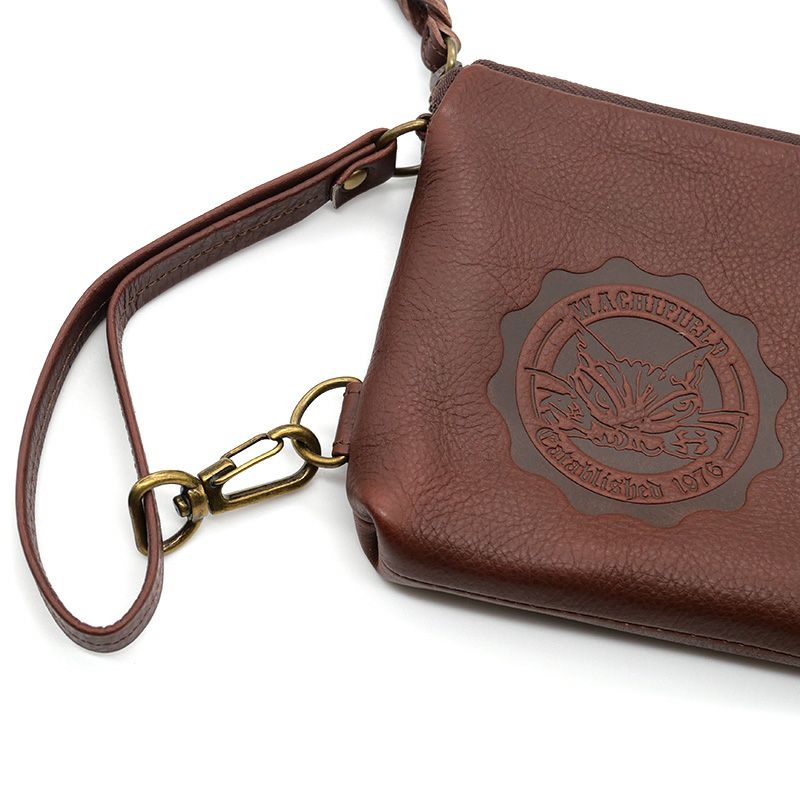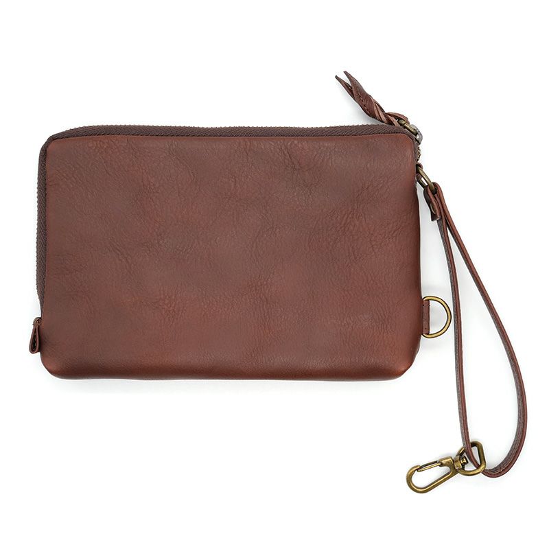 「スマホを入れたい!」という声にお応えして登場した、大きなサイズのレザーポーチ。カバー付きや大型スマホもすっぽり入り、カードポケットも付いているので、ちょっとそこまで行くときにこれだけ持って出られるので便利です。ストラップをDカンに留めればハンドルに。プレーンな型押しデザインでギフトにもおススメ。