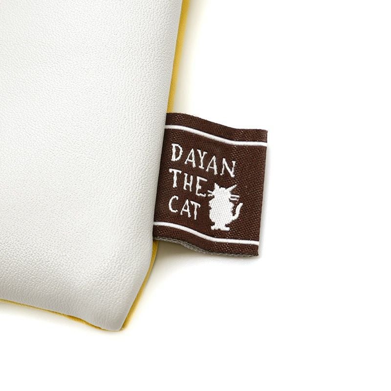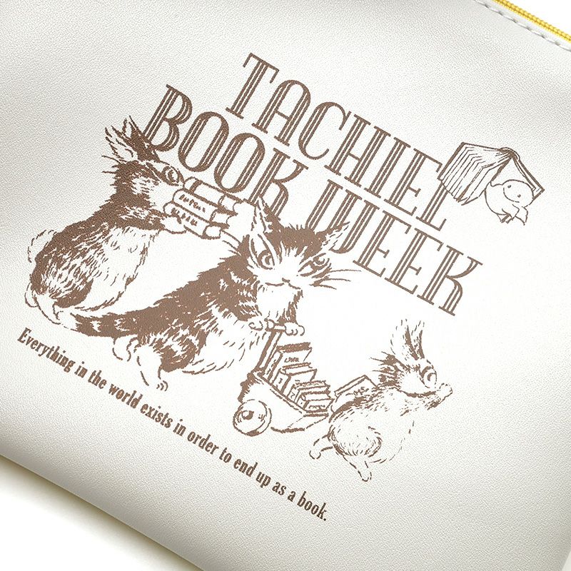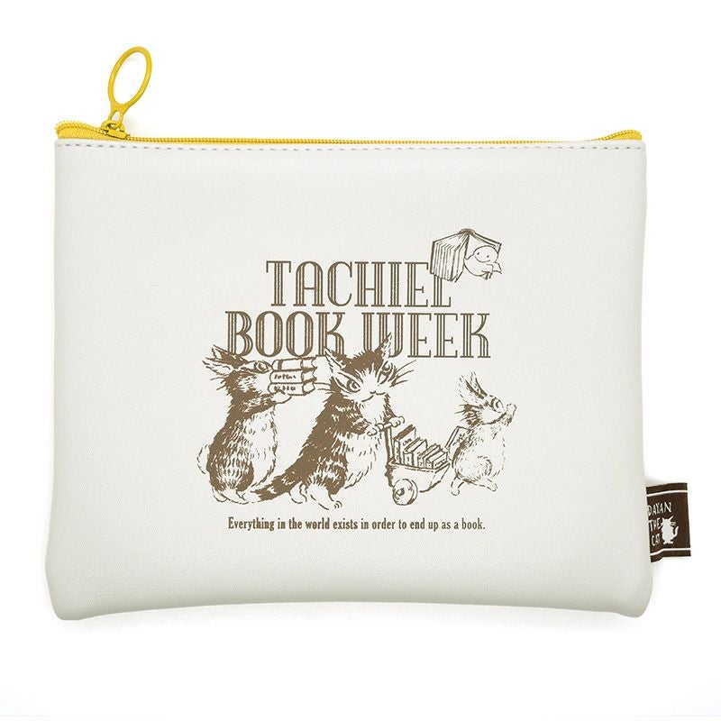 表と裏で生地の色が異なっている、配色デザインのフラットポーチ。薄めの文庫本であれば、入れて持ち歩くことができるサイズ感です。本の背表紙をイメージした織りネーム付き。