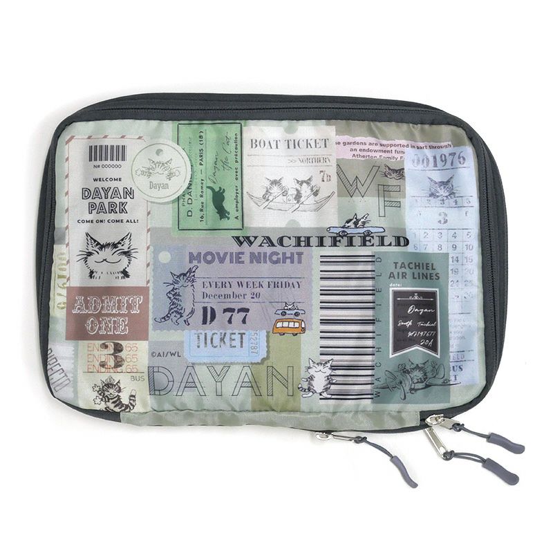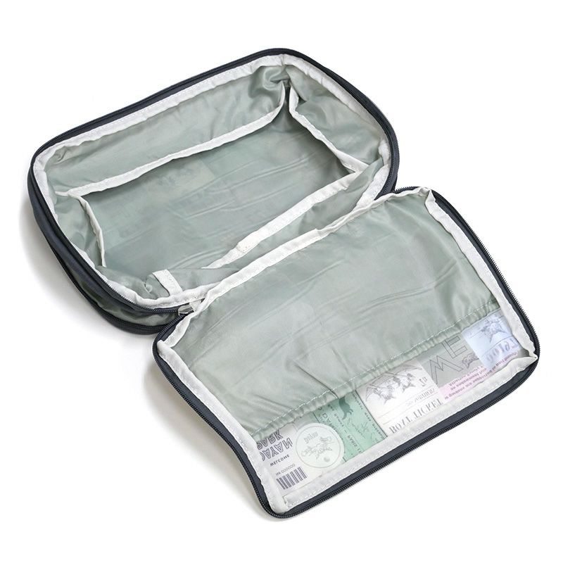真ん中が仕切りになっていて、表裏の2室に収納できるポーチです。荷物が増えた時に開けてマチを増やしたり、閉めることで簡易的な圧縮が可能なファスナー付き。インナーやタオルなど小物を入れるのに便利なサイズで、旅行のお供におすすめです。