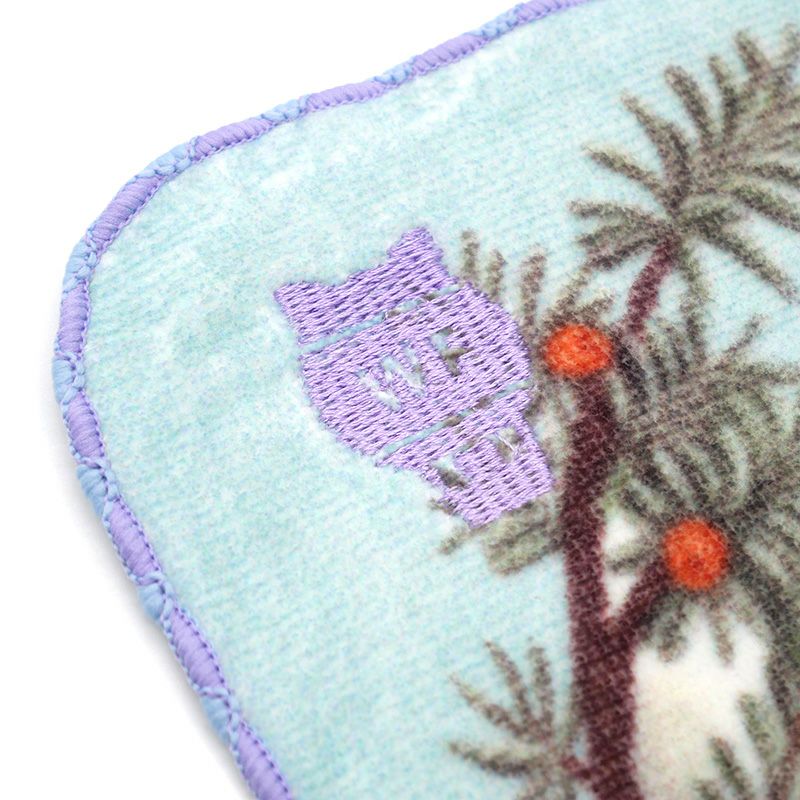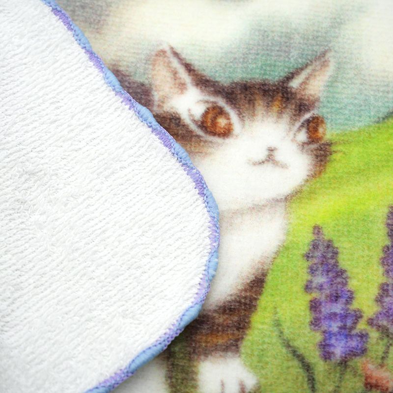 ワンポイントの刺繍と飾りメロー巻きで彩られたミニタオルです。表のプリント面はシャーリング地、裏面はパイル地です。