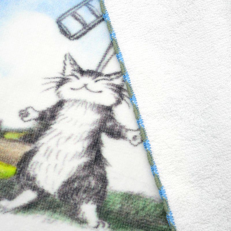 ワンポイントの刺繍と飾りメロー巻きで彩られたミニタオルです。表のプリント面はシャーリング地、裏面はパイル地です。