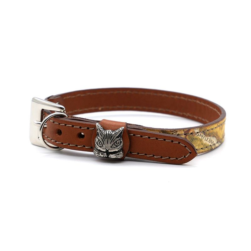 クラシカルな雰囲気が魅力的なわちふぃーるどの古地図柄を使って、猫ちゃん用のレザー製首輪を作りました。シックなデザインに、ダヤンの金具がワンポイントになっています。