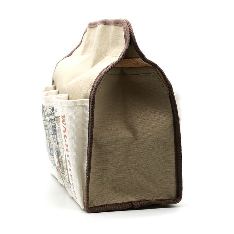 側面に6つのポケットが付いた、高さのあるティッシュボックスケースです。ティッシュ箱は薄いタイプが3個入るので、ストックケースとして兼用できます。ポケットにリビング周りの小物を入れられる、便利な収納アイテムです。