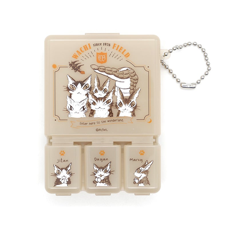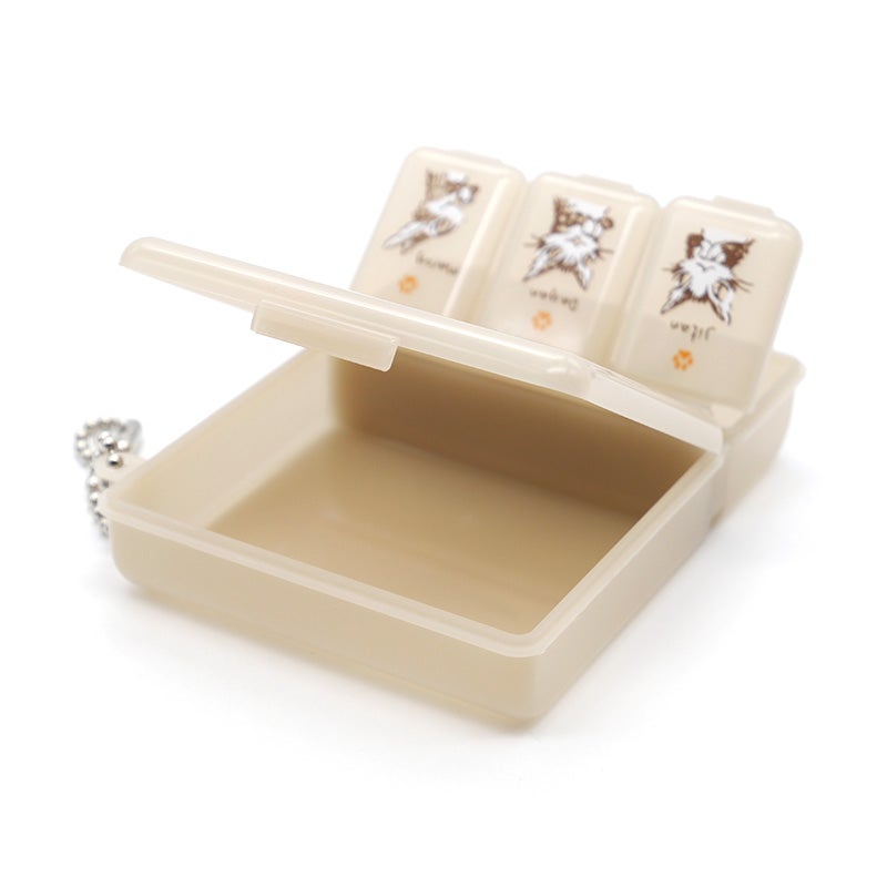大きなマス1個と小さなマス3個に区切られたピルケースです。小さなマスはお薬を朝・昼・夜用に分けて入れられます。持ち運びに便利なボールチェーン付き。