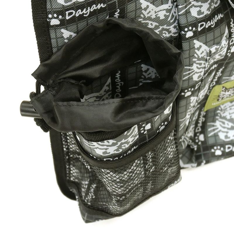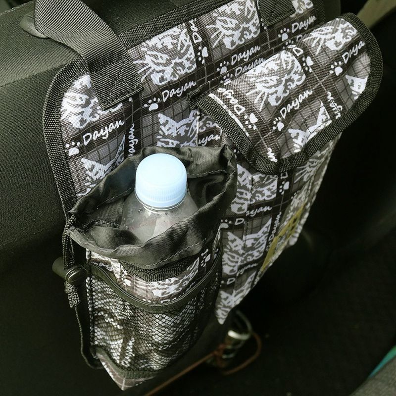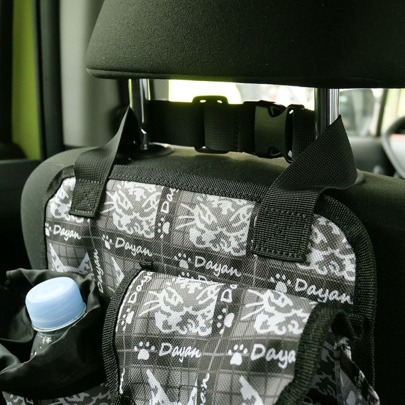 ダヤンいっぱいのカーグッズ。車のシート背面に掛ける小物入れです。左側はペットボトルが入るポケット。内側はアルミ蒸着フィルムになっているので、ある程度の保温・保冷効果があります。右側はかぶせ付きポケット。マチありなので色々入ります。後部座席のちょっとした小物入れに、コンパクトに取り付けられるので便利です。