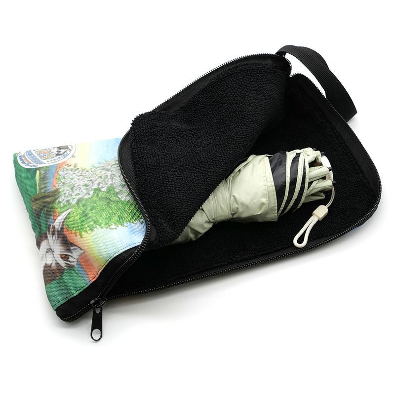 内側が吸水性の高いマイクロファイバー素材になっているので、濡れた折りたたみ傘やペットボトルを入れるのに適したカバーです。ポーチのように、ファスナーでしっかり閉めることができます。