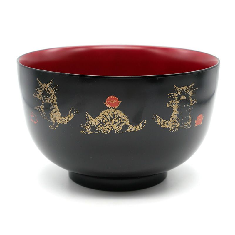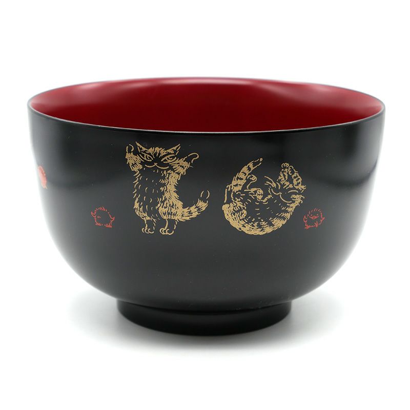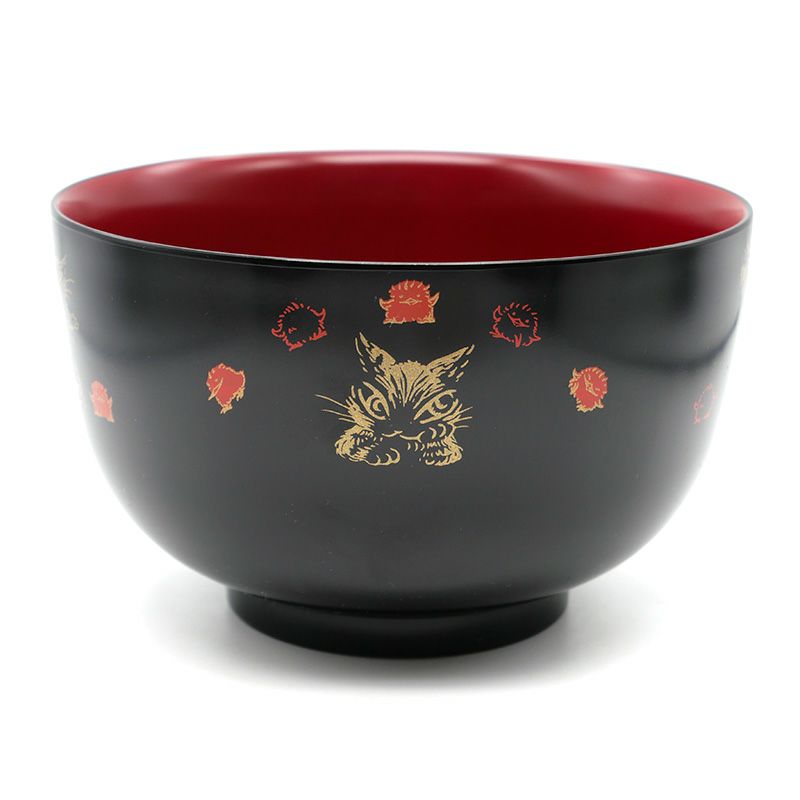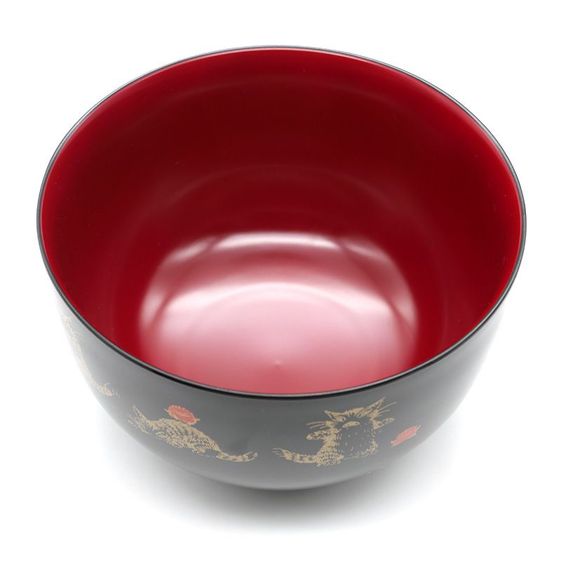 伝統的な黒と朱に塗り分けた食器のシリーズ。和風テイストのイラストがかわいい樹脂どんぶりです。樹脂の器は軽くて割れにくいだけでなく、熱伝導しづらいのでお湯を入れて持っても熱くなりにくい特徴があります。