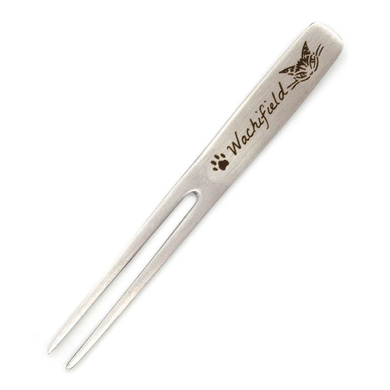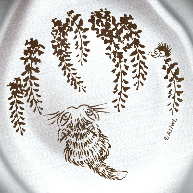 すっきり涼やかなステンレス製丸皿とかんざしフォークのセットです。デザインも相まって、わらび餅や大福など和菓子にぴったり。藤棚を眺めるダヤンの柄は、レーザー刻印です。