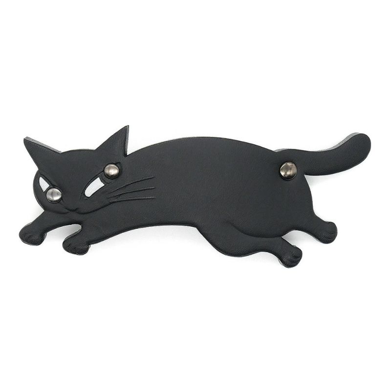 エンボス加工と瞳に見立てたカシメ、白目の着彩で、影猫チップの生き生きとした姿を牛革で表現したバレッタです。厚みのある革を貼りあわせ、しっかりとした存在感。革工房が長年作り続けている、わちふぃーるどの定番アイテムです。ちなみに影猫チップとは、ダヤンの影。ダヤンと同じく、好奇心旺盛な性格をしています。