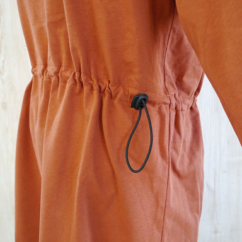 ウエスト辺りのコードはスパン(ゴム)で、ニュアンスを出しても、そのまま絞らずストンと着てもOK。長袖の袖先はゴム入部分とリブの切り替えでちょっとした優しいアクセントにもなっています。