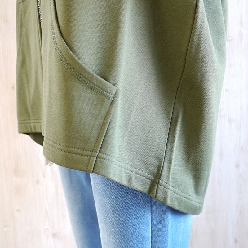 シーズン長く大活躍。フルジップなので脱ぎ着がしやすく、重ね着やこまめな体温調節がしやすくてとってもおススメです。前後で丈に差をつけ、後が長めなので体系カバーにも。