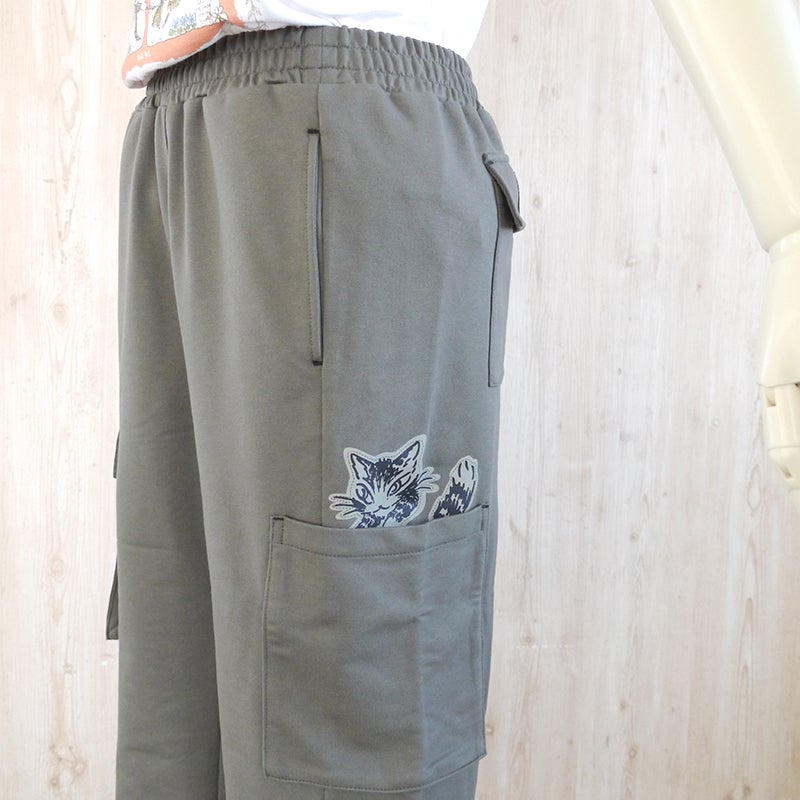 太めなワイドシルエットで、街着にもなるスウェットパンツ。混紡素材のミニ裏毛ではき心地も良いです。ポケットからちょこっと覗くダヤンがかわいい。3シーズンさらっと穿けるように、生地が厚すぎないのもポイントです。肌寒いシーズンには中にスパッツなどを穿いてちらみえ重ね穿きもおススメ。DTC:DAYAN THE CAT KH:アッシュカーキ系