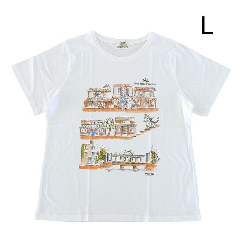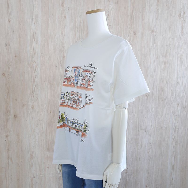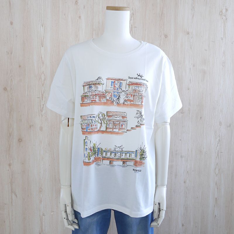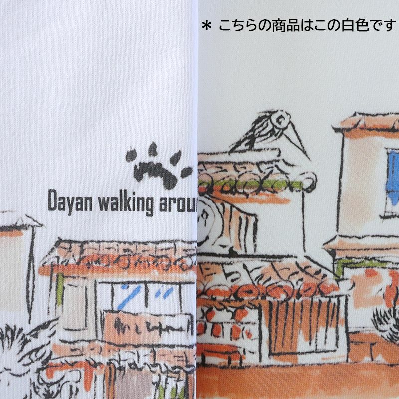 スケッチタッチのカジュアルな絵柄。ダヤンがのんびり街をお散歩しているプリントです。素材感は柔らかめで少し薄手の素材感。色はオフホワイト。