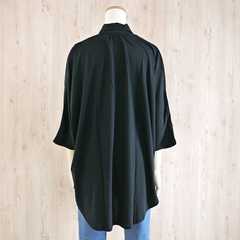 7分袖丈のドルマンスリーブ。たっぷり巾とたっぷり丈で、そのままでも長袖Tなどと重ねて着ても素敵です。小さめの衿も、控えめなギャザーも、カジュアルなカットソー素材もおしゃれポイント。