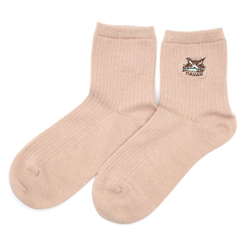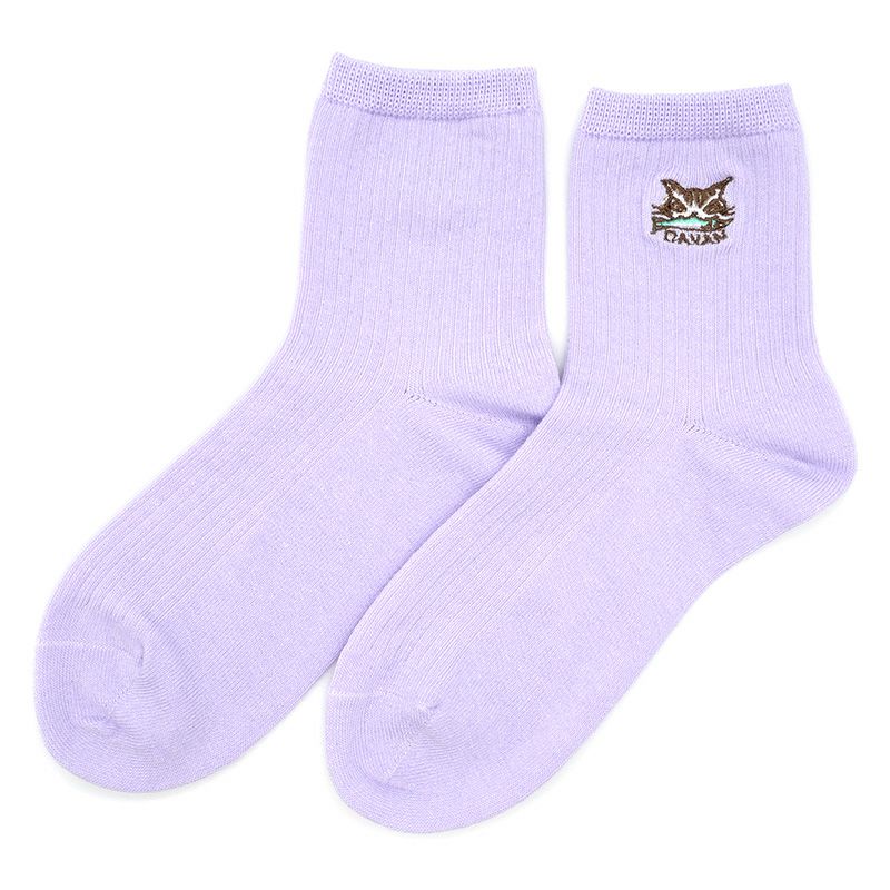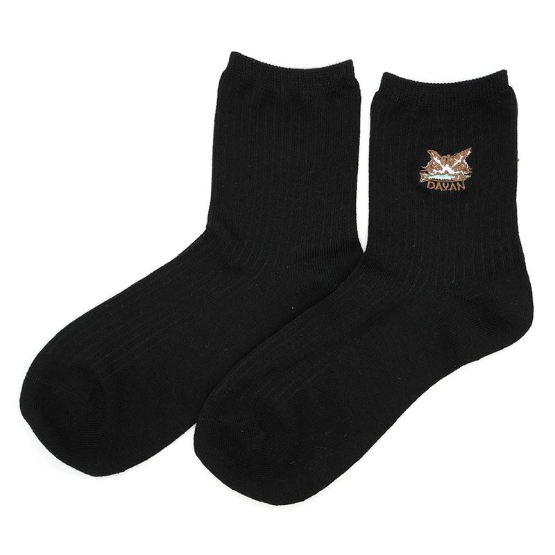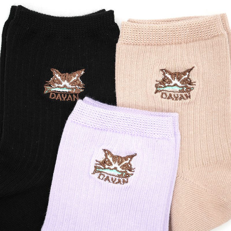 お揃い刺繍ワンポイントの靴下3色セット。ロークルー丈で普段使いにぴったりです。おさかなをくわえたダヤンがキュート。