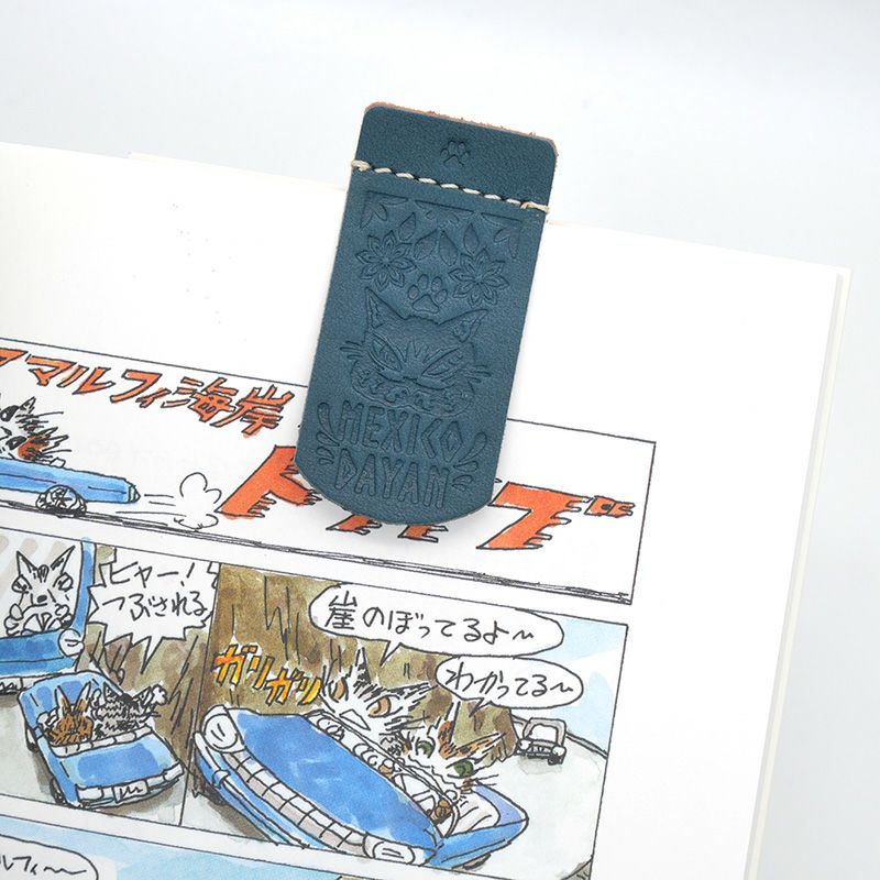 ページに挟むと肉球の型押し部分がひょこっと飛び出て見える革しおり。メヒコテイストのカラフルな色の組み合わせが陽気で楽しいです。