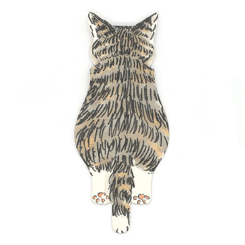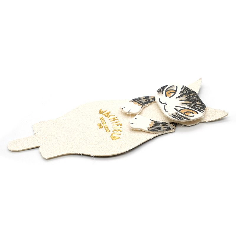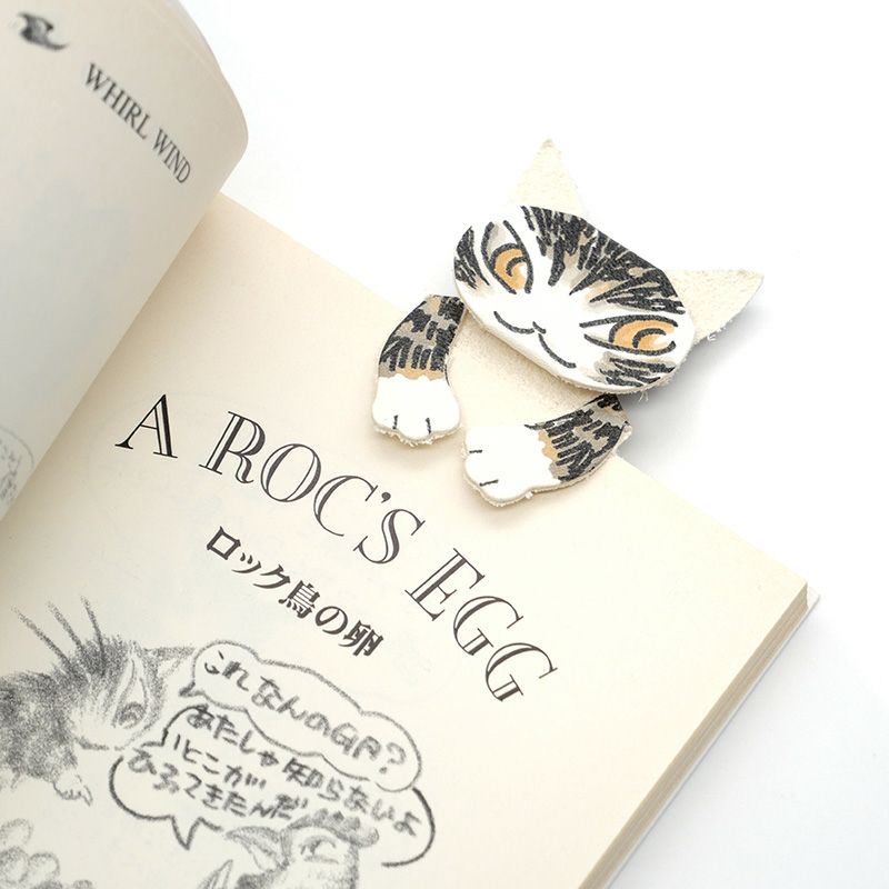 ダヤンが両手でページを押さえて、本からひょっこり顔を覗かせる姿がかわいい革しおりです。後ろ姿もポイントです。