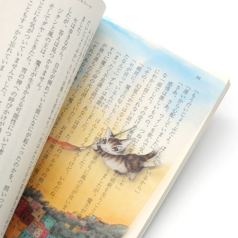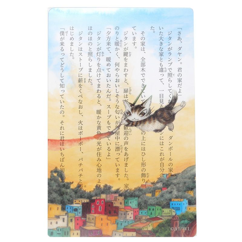 本を読むのが楽しくなる仕掛けのしおりです。文庫本の一回り小さいサイズで、1ページ全体にかぶさる大きさ。クリア素材で文章とイラストが重なって、まるでダヤンたちが物語の中にいるような感覚に。しおりの材質はほどよい柔らかさで、本に合わせて曲がってくれます。クリアポストカードのように飾ってもかわいいです。