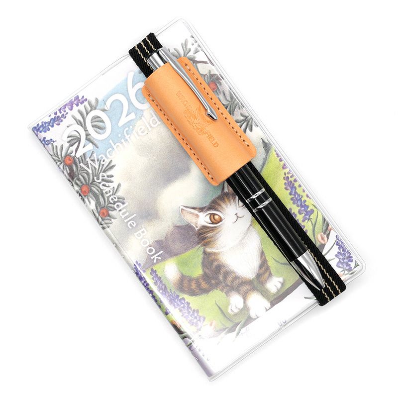 わちふぃーるどのWFスケジュールやA6スケジュールにちょうど良いサイズのゴムバンドです。バッグの中で手帳が開いてしまうのを防ぎます。革製のペンホルダーは、太軸ペンも挿せる仕様。付属のペンは軽くて書き味なめらか。インクは黒です。