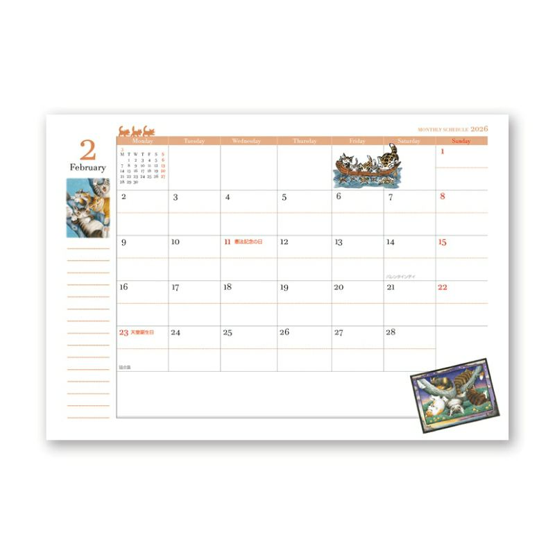 マンスリーページ(2025年10月~2026年12月)とフリーのメモページが入ったスケジュール帳です。中身のイラストはフルカラー。ダヤンと仲間たちが毎日を彩ります。サイズはA6の手のひら大でコンパクト。ウィークリーページが無い分薄型で、ページが楽に180度開くので書き込みしやすく、ウィークリーは使わない・薄い方がいい、という方におすすめです。透明ビニールカバー付き。