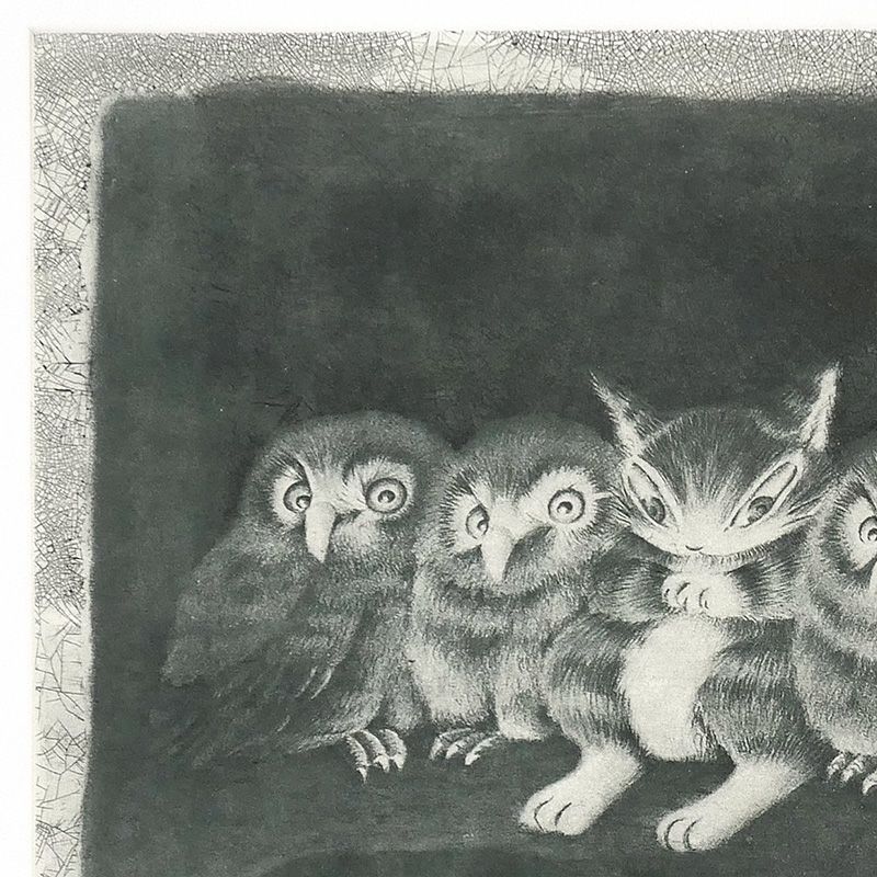 往年の人気作品「ふくろう裁判」をもとに、非常に雰囲気のある銅板貫入エッチング(=貫入銅版画)を加藤史郎版画工房さんにつくっていただきました。